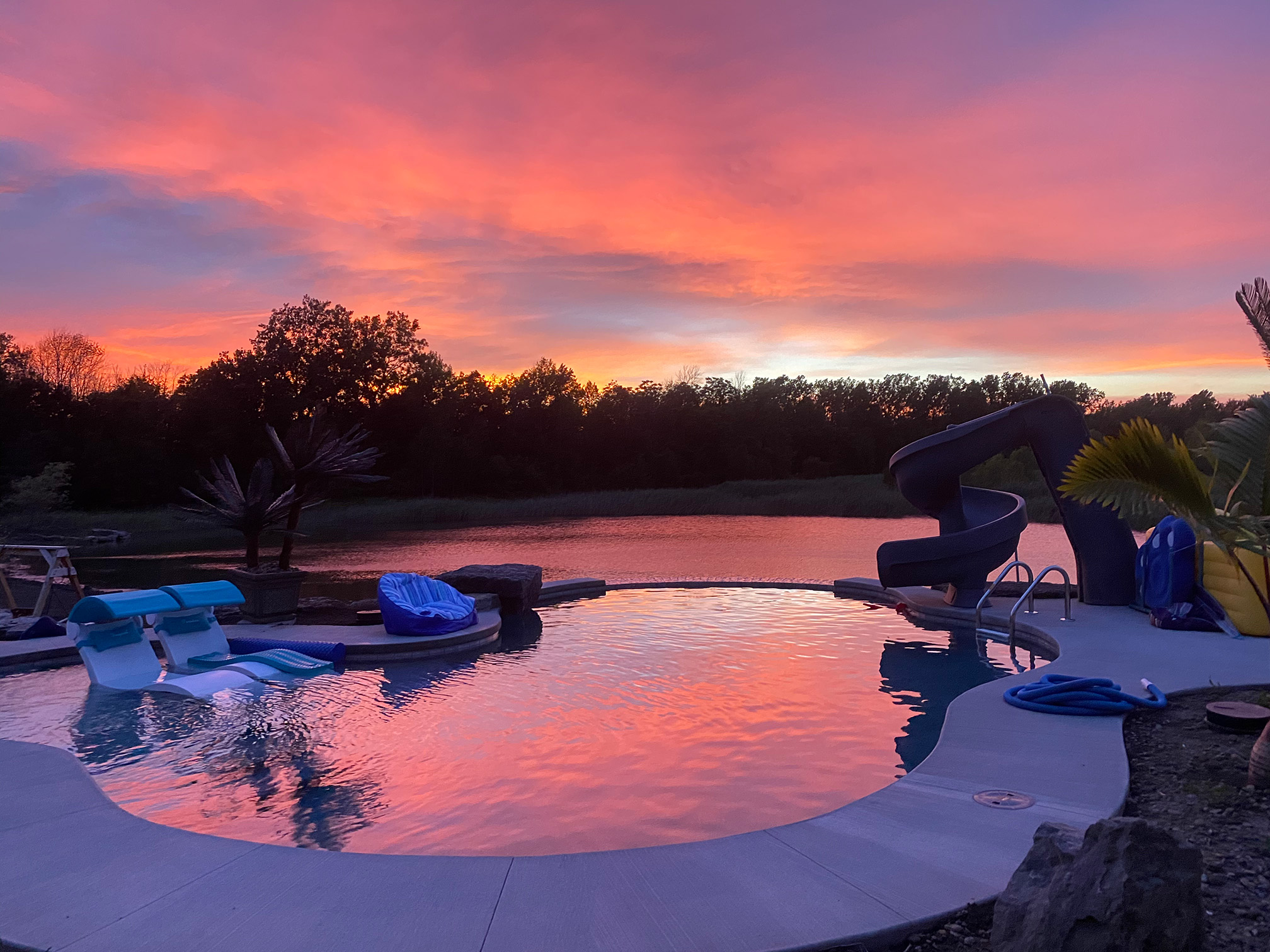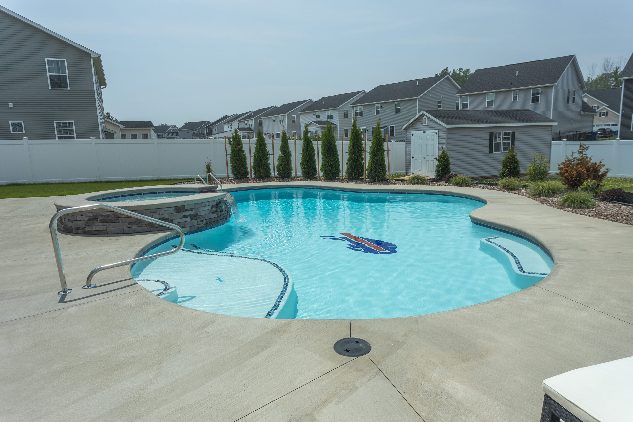 Beautiful oasis, complete with a dark coping order, expansive pool house, and laminar water spouts