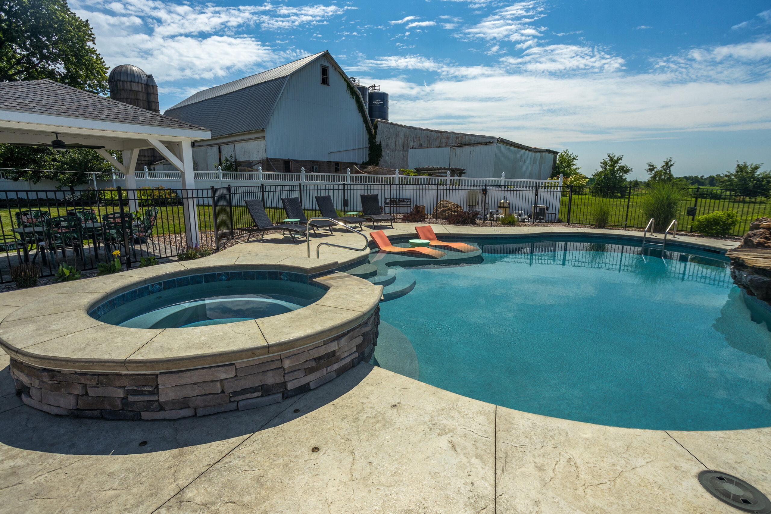 Custom gunite pool, featuring a gorgeous spa and an elegant tiered patio.