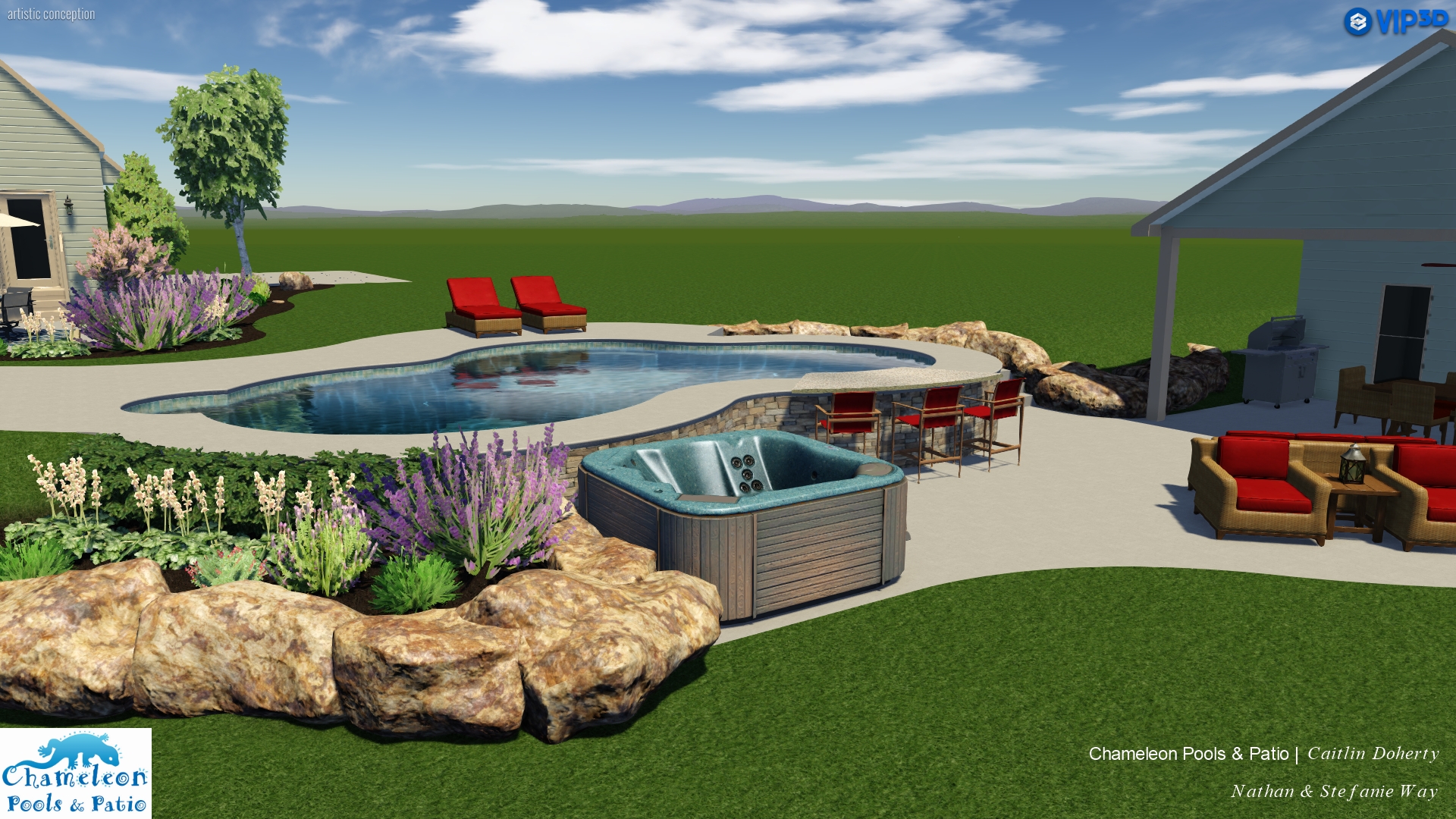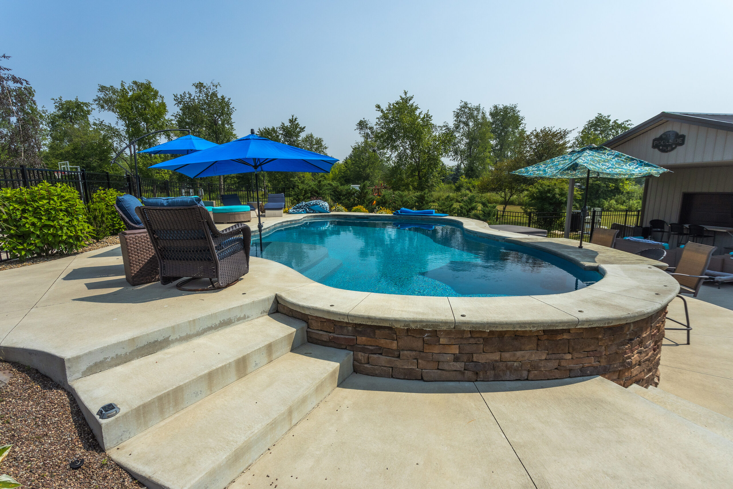 The main feature of Lounger’s Delight is the built-in bar that uses the pool’s retaining wall, connecting the entertainment area at the bottom of the steps with the rest of the pool area. The retaining wall is a feature in and of itself — this is the largest retaining wall we’ve done so far, and it lends perfectly to the natural shape of the client’s backyard.